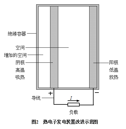 根據(jù)熱電子發(fā)電裝置的結(jié)構(gòu)可知,在陰極溫度、陽極溫度不變的情況下,或在陰極與陽極之間的溫度差不變的情況下,如果使陰極的左表面與絕緣容器的左內(nèi)表面之間增加一個(gè)空間(見圖2),則陰極的左表面要向增加的空間發(fā)射熱電子,陰極發(fā)射出的熱電子數(shù)要增加,陰極的電勢(shì)要升高,陰極與陽極之間的電勢(shì)差要增大,熱電子發(fā)電裝置的輸出功率要增大,熱電轉(zhuǎn)換效率要提高。
