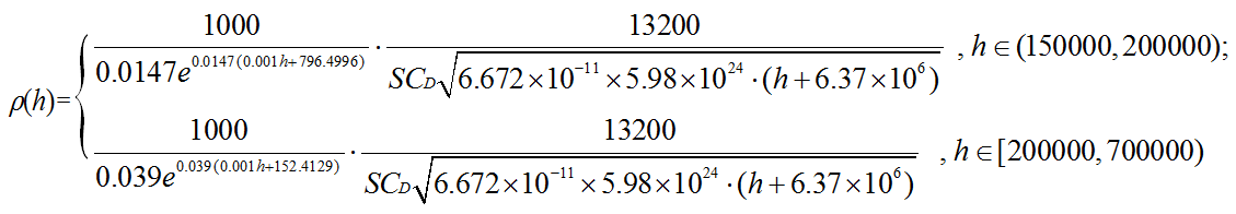 通過查閱相關參數數據得到衛星質量m=13200kg, 并假設衛星受阻面積為16m2, 對地軌道速度為7800 m/s, 即Ma= 22.9. 從表 1中我們可以得到相應的CD=0.11283. 從ρ(h)函數關系可以解出如下表所示的在一些特定高度的大氣密度估計值.
