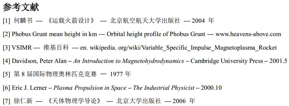 假設在發動機工作高度的大氣 (等離子)密度是 5×10-10 kg/m3, 且等離子體收集器的面積為S= 200 m2. 航天器(衛星)以 8000 m/s 的速度運動. 然后代入S、c、v、ρ, 并假設Isp=50000s (這是這種發動機預計可以達到最高性能), 我們可以得到F≈392. 4N 和u= 490500 m/s (無論采取了何種加速方法). 這對于現代衛星來說是相對好的推進參數.