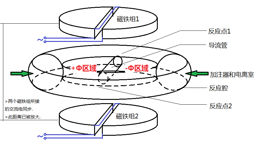 如圖, 兩組電磁鐵平行放置, 反應腔夾于磁鐵之間. 每個電磁鐵組水平均分為兩半, 中間以狹縫隔開. 其線圈繞組使得在通交流電時兩半的磁場方向相反, 大小相同. 兩組電磁鐵通以同步高頻交流電, 于是就可以使兩組電磁鐵之間的半邊磁通量變化, 從而在反應腔所在的位置產生渦旋電場. 兩邊的渦旋電場在反應腔中部橫穿的導流管處疊加. 導流管兩端自然產生主、副對撞點, 即反應點1和2. 反應腔內同時還存在水平方向同軸的環形磁場(此點與托卡馬克相同), 用于約束粒子沿環形軌跡運動, 并在反應點處收緊以壓縮等離子體.