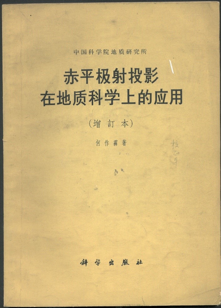 “極射赤平投影”不僅是研究巖組學的重要工具,而且也是地質(zhì)構(gòu)造研究方面的方法典范,在地質(zhì)學上廣泛應(yīng)用。何作霖是我國第一個對該方法在地質(zhì)科學上應(yīng)用做綜合闡述者。他集多年的理論研究、科研實踐及各國零散資料撰寫出版了《赤平極射投影在地質(zhì)科學中的應(yīng)用》(科學出版社,1958)一書,深受巖礦工作者喜歡,后又多次再版。這是世界上第一部這方面的專著,也是中國構(gòu)造地質(zhì)學和巖石礦物學工作者長期必讀的重要工具書。
