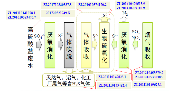 基于嗜鹽嗜堿硫氧化菌開發氣體生物脫硫及硫回收工藝,我們將其在高硫酸鹽廢水和煙氣脫硫脫硝中進行應用,并對關鍵流程的知識產權進行了全面布局(圖1-8)。