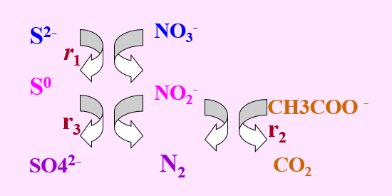 在自養和異養微生物共存條件下,硫化物和有機物(以乙酸鹽為例)的氧化途徑如圖2-5所示: