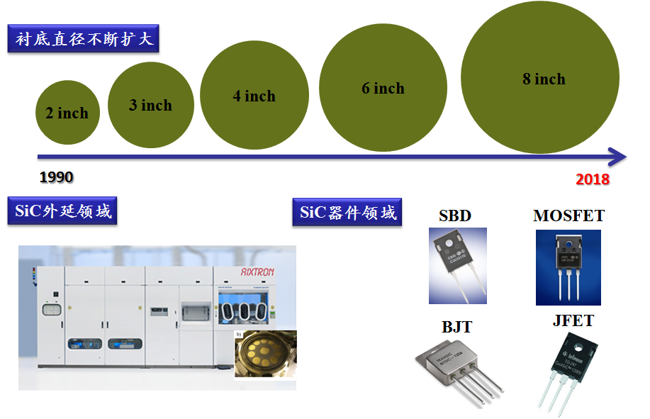 碳化硅材料的發展是非常迅速的,從1990年開始,2英寸的碳化硅出現之后,到2015年8英寸的碳化硅也已經出現了,但是8英寸的碳化硅材料質量還不夠成熟,現在最成熟的是4英寸和6英寸的?,F在量產的情況是4英寸晶片在往6英寸轉,有一些國外的企業已經大規模使用6英寸碳化硅了,目前國內有很多6英寸硅的生產廠,把硅的設備改成碳化硅的設備,再添加一些碳化硅專用設備,就可以進行6英寸碳化硅的流片。