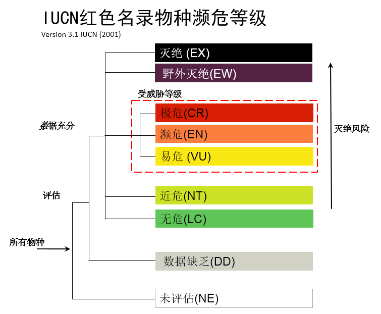 IUCN自20世紀60年代成立之日起,就設(shè)立了物種生存委員會(SSC),開始編制和印刷《IUCN瀕危物種紅皮書》,后來隨著評估物種的增加,印刷版逐步發(fā)展為網(wǎng)絡(luò)版的《IUCN瀕危物種紅色名錄》,定期編制發(fā)布。IUCN/SSC研究制定了《IUCN物種紅色名錄瀕危等級和標準》,根據(jù)物種的種群數(shù)量和分布情況等,評估其生存狀況,確定其瀕危等級。IUCN瀕危物種等級標準分為“有評估數(shù)據(jù)”和“數(shù)據(jù)缺乏”兩類,“有數(shù)據(jù)評估”中又分為“滅絕”、“野外滅絕”、“區(qū)域滅絕”、“極危”、“瀕危”、“易危”、“近危”和“無危”等8個級別,從“無危”到“極危”,滅絕風險逐步上升,瀕危等級逐步增加。瀕危等級標準有5個指標,分別是種群下降、有限地理分布區(qū)、下降小種群、非常小或非常有限的種群、以及模型模擬等量化分析,根據(jù)這些指標的數(shù)量閾值,來評估物種的瀕危等級。