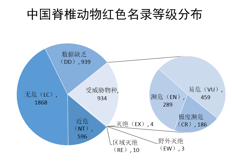 2015年完成的《中國生物多樣性紅色名錄-脊椎動物卷》,共評估了中國4357種脊椎動物,包括673種哺乳類,1372種鳥類,461種爬行類,408種兩棲類,1443種淡水魚類。其中939種數(shù)據(jù)缺乏,1868種無危,596種近危,受威脅的物種共934種。在934種受威脅物種當中,易危459種,瀕危289種,極度瀕危186種。受威脅的原因分析中,過度利用、生境喪失和人類干擾是最主要的威脅因子。