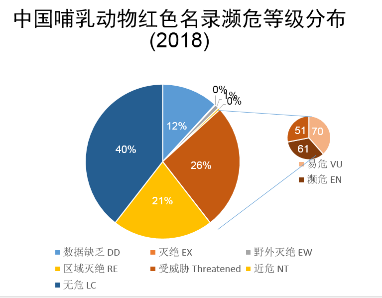 此外,我們對中國哺乳動物多樣性進行編目,分別于2015年和2017年完成了第一版和第二版,第一版中,我們收錄了673種哺乳動物,第二版中我們刪除了一些不存在的物種如倭巖羊,并增添了一些物種,主要是分布在藏南的一些物種,共收錄了693種哺乳動物,使得我國的哺乳動物總數(shù)位列全球首位。2015年發(fā)布《中國生物多樣性紅色名錄-脊椎動物卷》后,2018年又對該紅色名錄等級進行了更新,哺乳動物的情況來看,最新的評估結(jié)果中,受威脅的物種占26%、近危21%,無危40%,數(shù)據(jù)缺乏12%,其中有多個物種已經(jīng)區(qū)域滅絕、野外滅絕或功能性滅絕。部分中國特有的哺乳動物,中國生物多樣性紅色名錄和IUCN紅色名錄的評估結(jié)果,由于評估信息的不同,結(jié)果也有所不同,如白鱀豚、長江江豚等;還有一些哺乳動物由于并非中國特有,所以中國生物多樣性紅色名錄和IUCN紅色名錄評估等級有所不同,如野馬、賽加羚羊、麋鹿、蒙原羚、河貍等。
