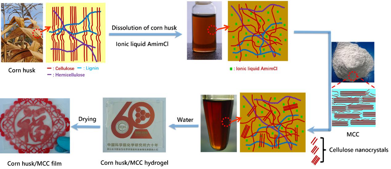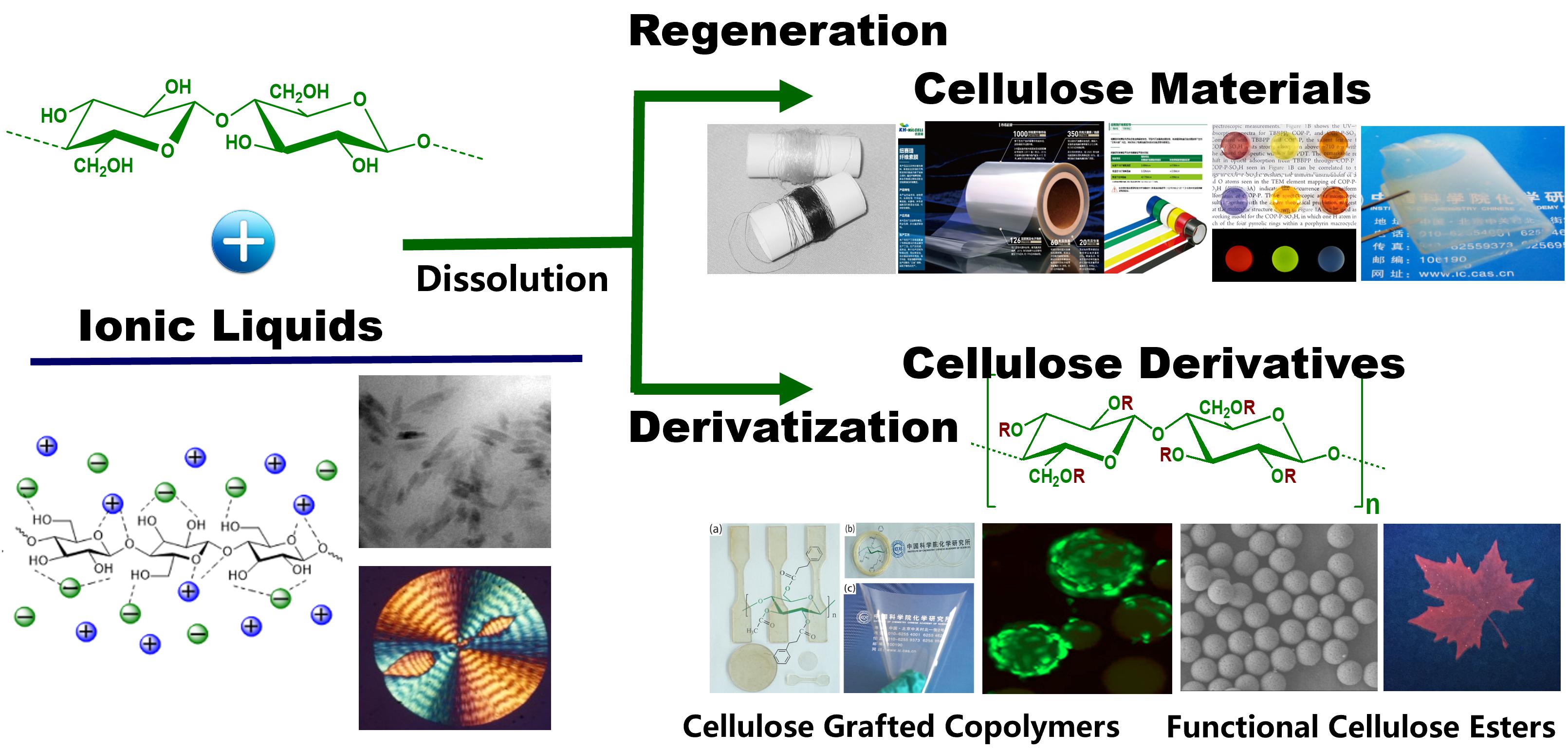 我們做出的兩類離子液體溶劑,可以在一個很溫和的條件下(一般不超過100℃)將纖維素溶解。過去一二十年有很多人做纖維素的離子液體體系,目前公認最好的三種離子液體中有兩種是我們發明的,其中AmimCl可以溶解木材,被稱為溶解能力最強的溶劑。后來我們提出了它的溶解機理,我們認為離子液體陰陽離子結構和纖維素羥基的分別作用把里面原來氫鍵打開,像剪漁網似的,使它變成線性的分子才能溶解。